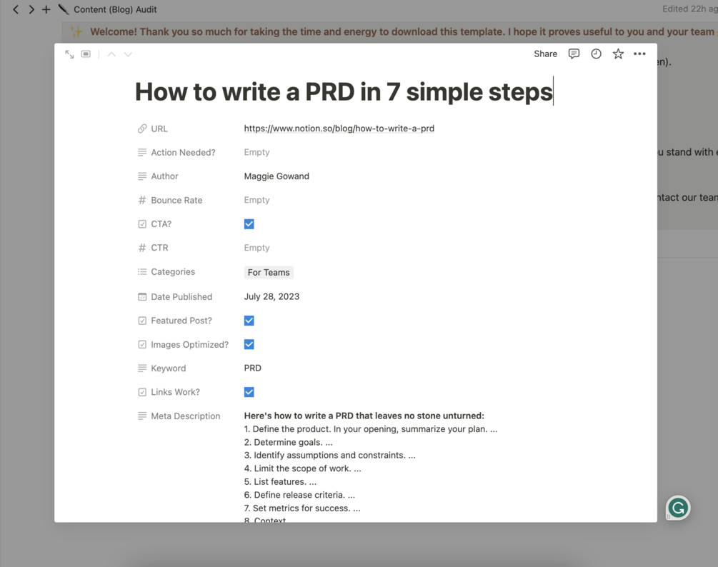 With this template, you can uncover opportunities for improvement, streamline your content strategy, and consistently produce high-quality, engaging posts that resonate with your audience. ⚡️Fully customizable depending on your preferred content channels and blog styles, this template is adaptable to fit your business and marketing needs.